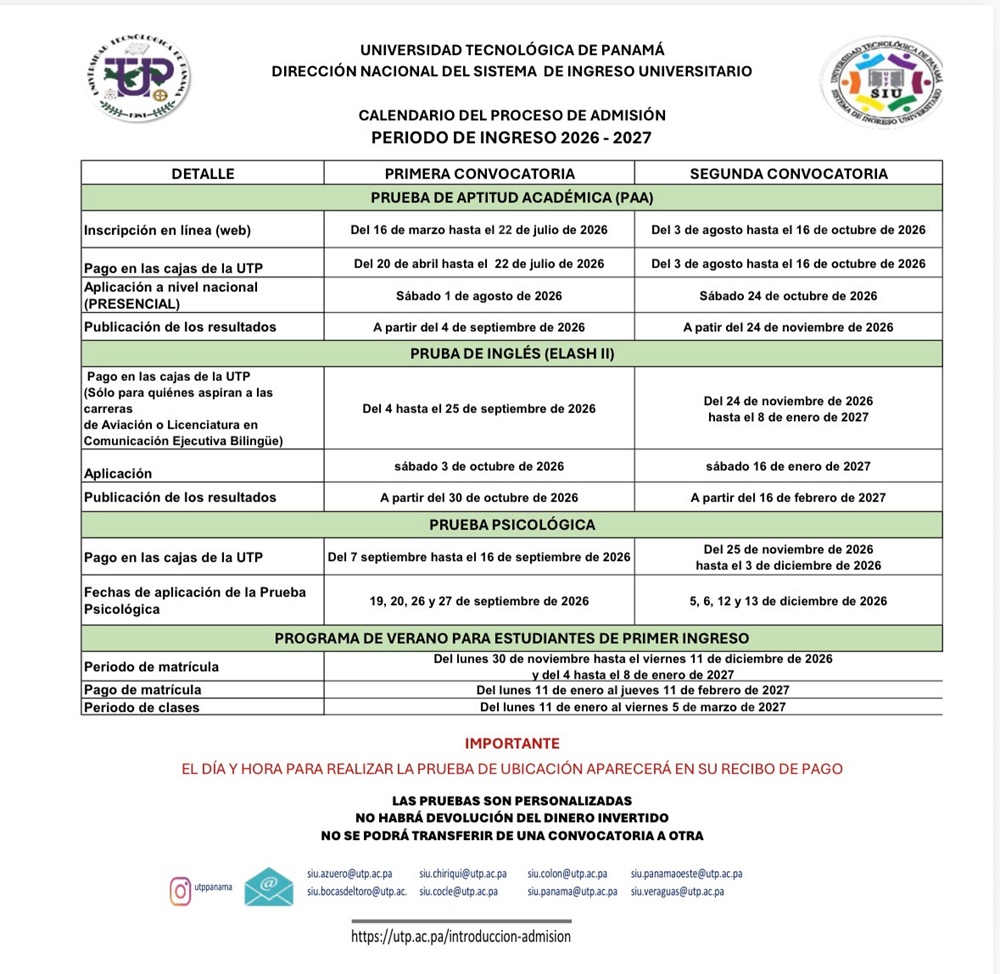 Para obtener más información sobre las pruebas ingresa a Sitio Web UTP / Admisión / Pregrado / Información sobre las pruebas.