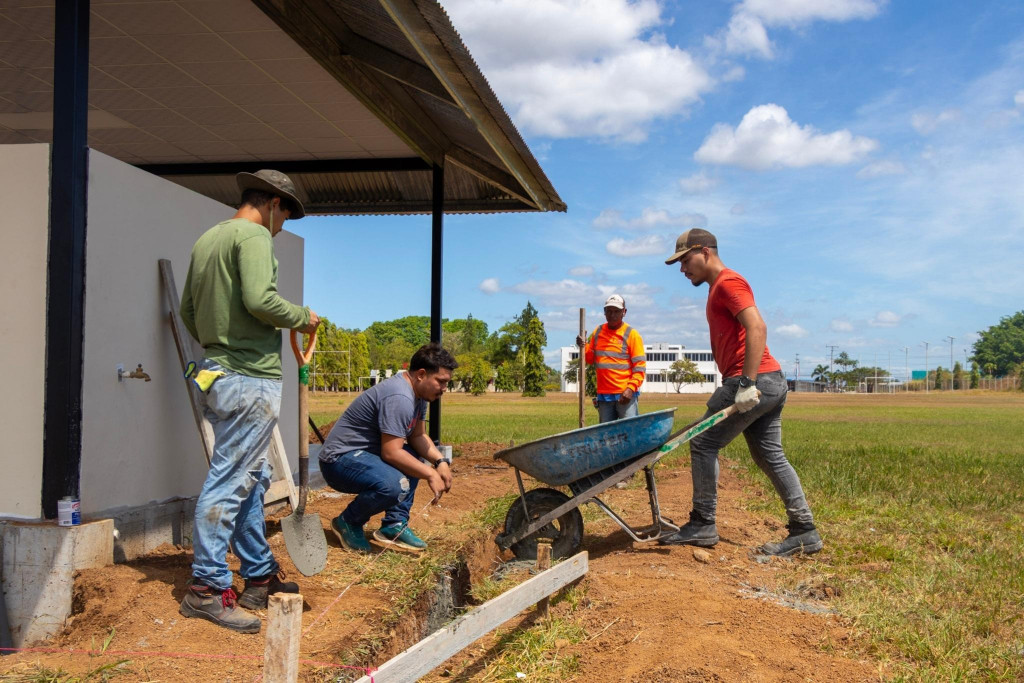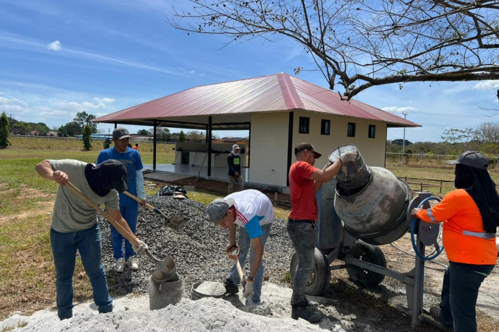 Durante la ejecución de los trabajos, los estudiantes desarrollaron labores técnicas vinculadas al proceso constructivo, entre ellas la colocación de lechadas para acabados en pisos y baños, la elaboración de fundaciones para aceras, la preparación y vaciado de concreto para bases estructurales, así como la adecuación del terreno para la construcción de nuevas aceras, particularmente en el área contigua a la terraza estudiantil.