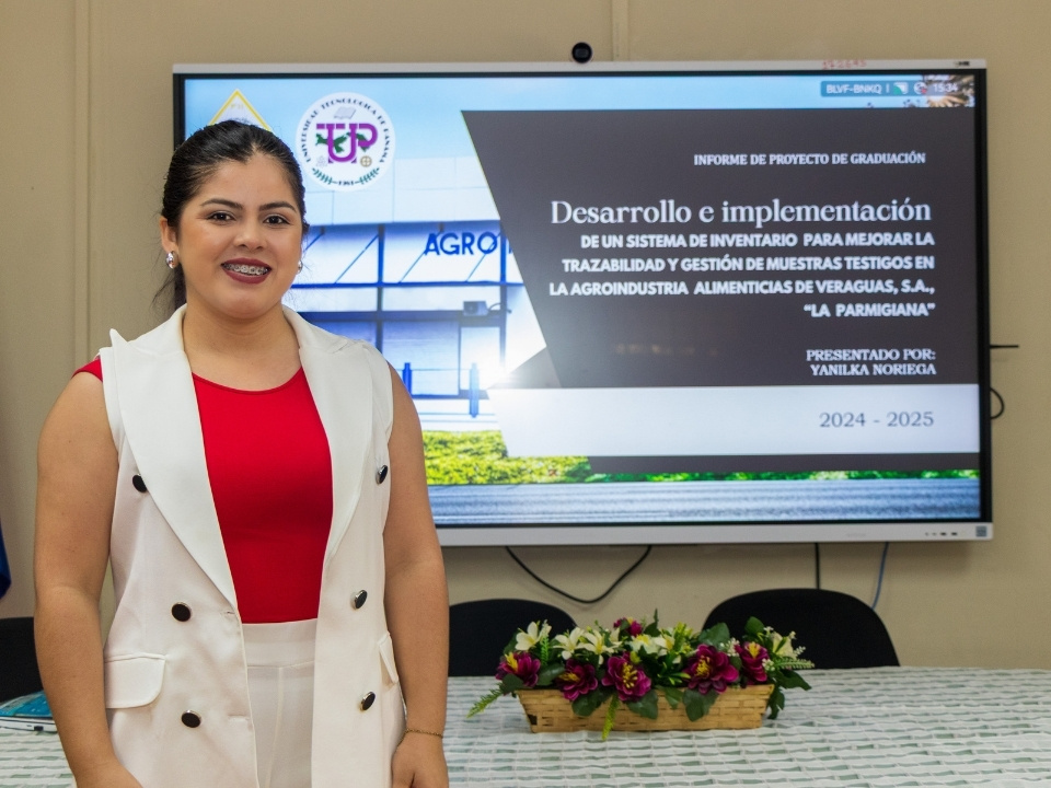 La estudiante Yanilka Noriega, de la Licenciatura en Logística y Transporte Multimodal del Centro Regional de la Universidad Tecnológica de Panamá (UTP) en Veraguas, sustentó su práctica profesional con el tema: “Desarrollo e implementación de un sistema de inventario para mejorar la trazabilidad y gestión de muestras testigos en la Agroindustrias Alimenticias de Veraguas, S.A., La Parmigiana”. El jueves 21 de agosto de 2025.